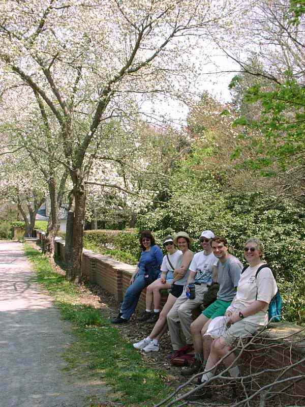 of the group paused to sit atop the wall near the garden under some flowering trees.