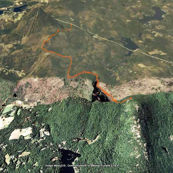 view in Google Earth of the trail from the shoulder of Pratt Mountain out to