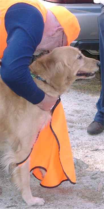 custom-made florescent orange doggie vest and Tom wore a hat that