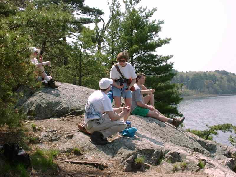 decided to hang out closer to the river's edge in the sun. Jan grabs a snack as Gary