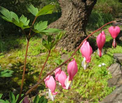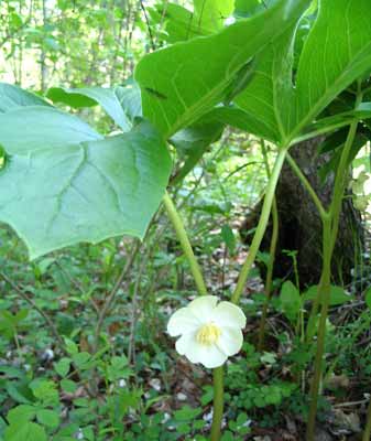 flower is a Mayapple. The red flowers below are "Bleeding Hearts".